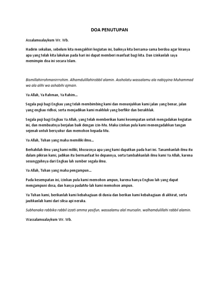 Documents similar to teks doa pembuka dan penutup dalam acara. Perhatikanlah contoh teks doa di bawah ini! Rabbana taqabalminna innaka antassamiul alim. Contoh doa pembukaan ibadah natal. Doa seperti apa yang akan kita baca?